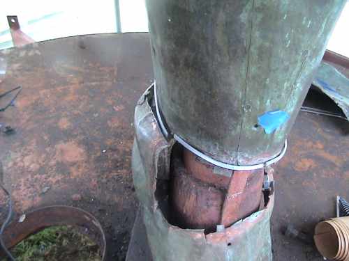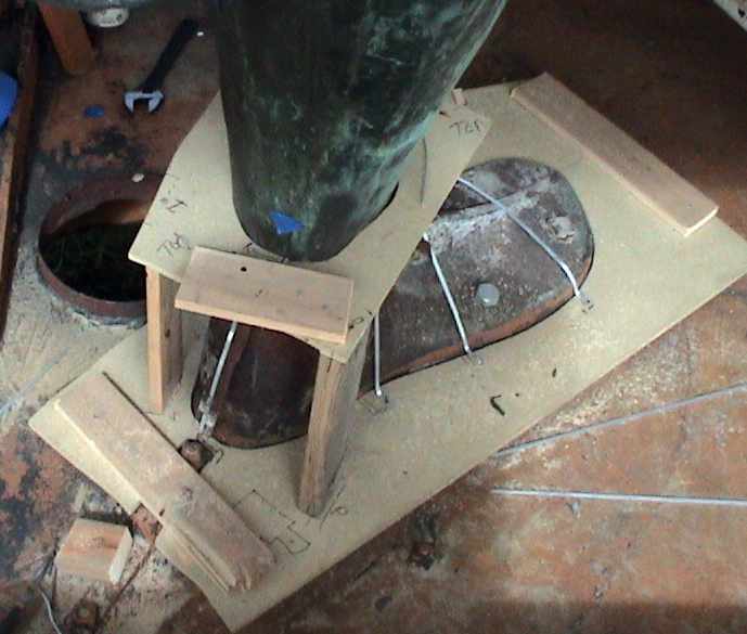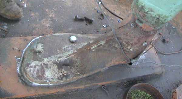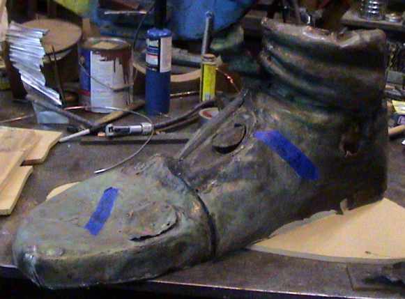 Boots not, to tell. The cast iron sole of Herman's right foot. Previous contractors working on the sculpture had cut holes in the top of the boot in an attempt to get at mounting bolts without unsoldering and removing the boot. They mainly made a mess. They also seem to have trimmed about and inch and a half of material off the bottom edge of the boot.